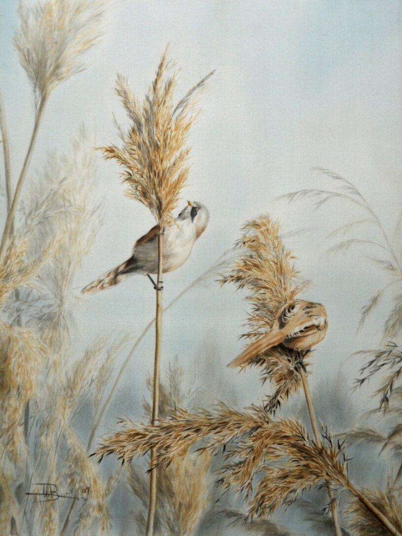Zuhause angekommen habe ich dann sofort mit meinem Bestimmungsbuch herausgefunden : Es waren Bartmeisen, und ich freute mich riesig, dass ich diese Art für mich entdeckt hatte. Ich konnte es kaum erwarten und begann umgehend das nächste Stück Seide einzuspannen, für ein neues Kunstwerk.