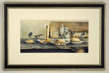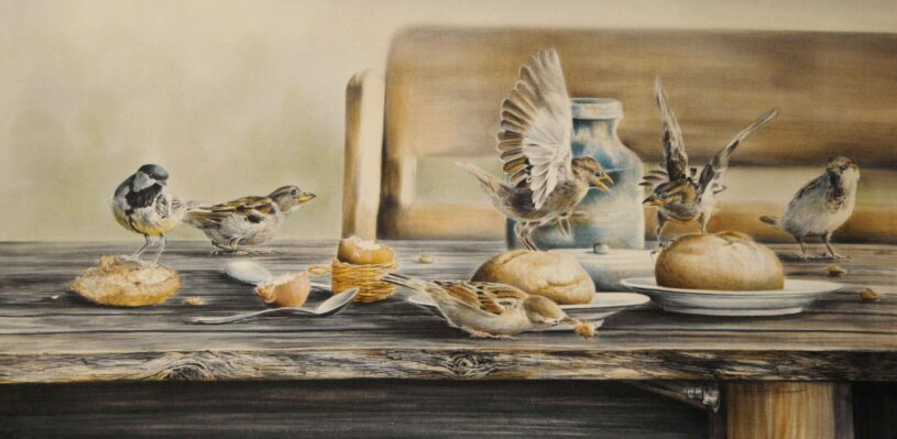 Meine kleinen "Gartengeier" können es kaum erwarten wenn wir vom Frühstückstisch verschwinden. Sofort stürzen sie sich auf ihre Beute.
