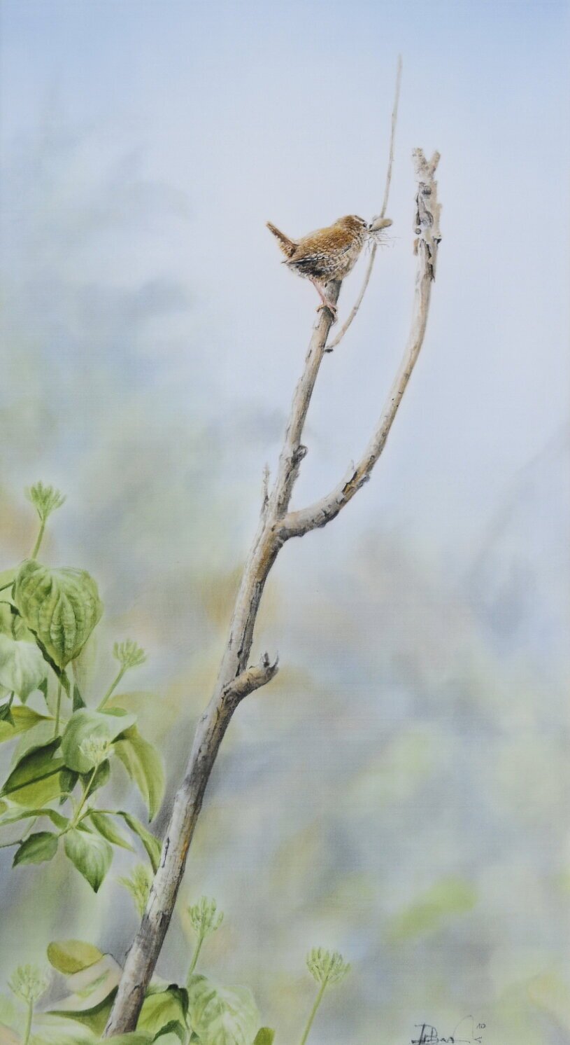 In einem alten Container, der als Geräteschuppen im Garten eines Freundes diente, hatte sich ein Zaunkönig ein winziges Kugelnest gebaut. Emsig trug er die Leckerbissen für die Königskinder in eine kleine Spalte neben der Tür. Ein winziges Nest in einem perfekten Versteck.