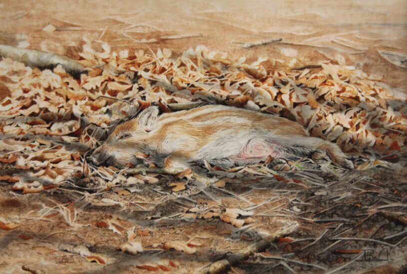 Wenn die kleine Rotte herumtobt und für das Erwachsenendasein schon mal kämpfen und schieben übt, dann macht das ganz schön müde. Da kommt doch so ein Laubhaufen gerade recht für ein kleines Nickerchen. Nur nicht den Anschluß verpassen!