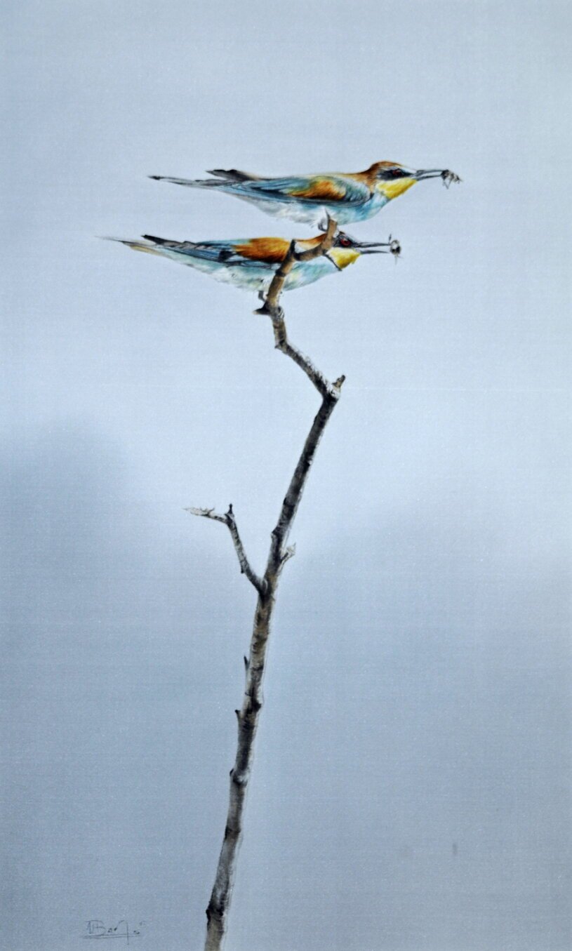 Ich verstecke mich unter einer Weide und hatte einen herrlichen Blick auf eine Ast, der den Bienenfressern als Landeplatz diente. Mein Versteck war erstklassig, denn ich musste nicht lange warten als sich die ersten Bienenfresser zeigten und auf jenem Ast landeten. Ein herrliches Flugschauspiel bot sich mit in den nächsten Stunden.