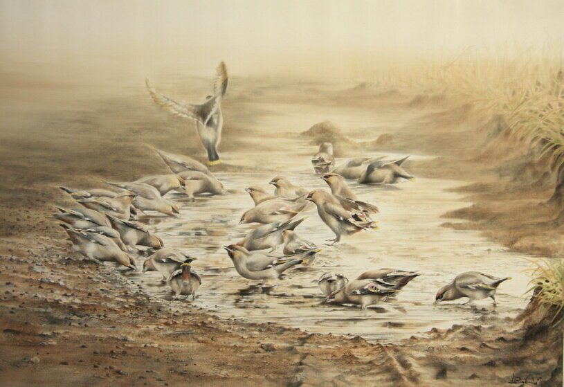 Es war ein herrlich frischer, sonniger Wintertag. Auf meinem Streifzug fiel eine große Vogelschaar in die Pappeln vor mir ein und machte sich über die Misteln her. Die klingelnden Geräusche sagten mir, dass es Wintergäste sein müssen noch bevor ich sehen konnte, wer die hungrigen Gäste waren. Erst als sie eine große Pfütze in der Nähe eroberten, um Wasser zu schöpfen, erkannte ich die Seidenschwänze. Emsiges Treiben war nun an dieser Vogelbadewanne zu beobachten.